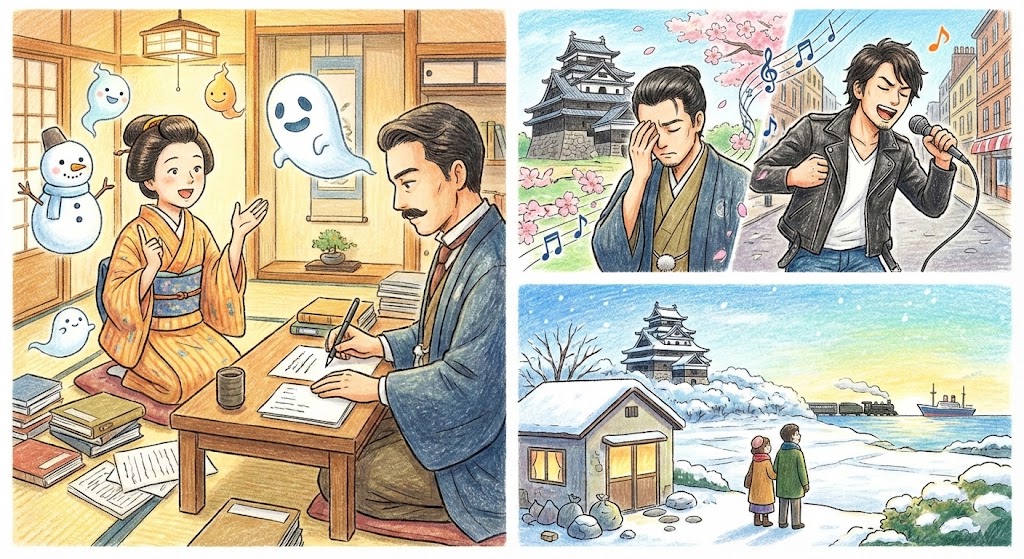 - ハーンの執筆(再話): セツの語りを聞いたハーンは、そのイメージを膨らませ、独自の文学的感性で英語の文章に仕立て上げる。