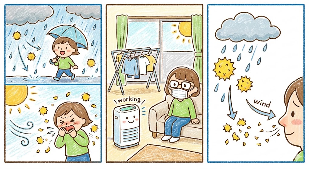 - ☔ 雨上がりの花粉は破裂して極小化するため「不織布マスク」を推奨。