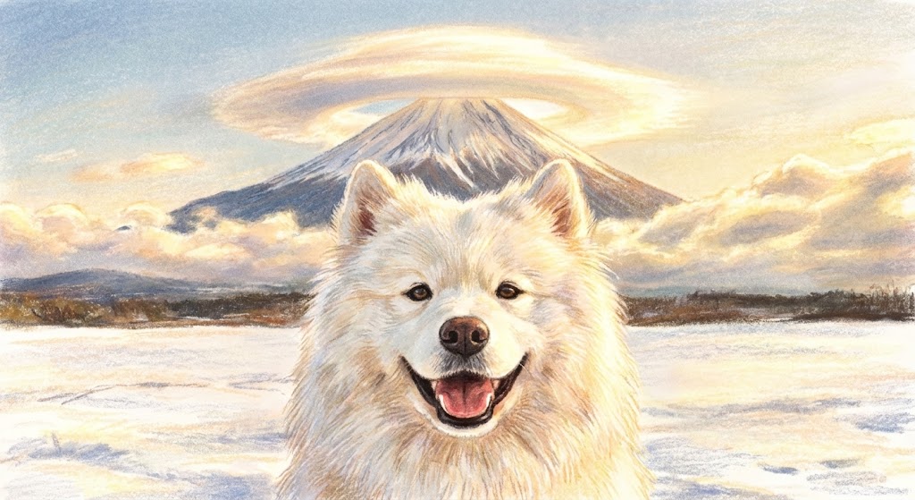 真っ青な冬空にそびえ立つ、日本一の山、富士山。 その手前で、まるで太陽のようにニッコリと微笑む純白の大型犬、サモエド。 そして、奇跡のようなタイミングで富士山の山頂にかかる笠雲(かさぐも)が、遠近法によってサモエドの頭上にポッカリと浮かび、「天使の輪」を描き出す瞬間。