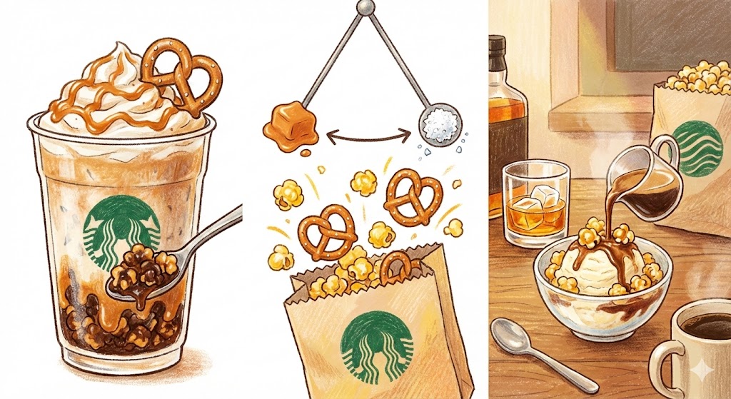 - トップ(上層):特製ホイップクリーム、さらなるキャラメルソース、そして砕いたソルトプレッツェル。